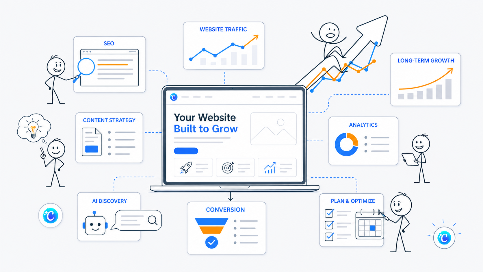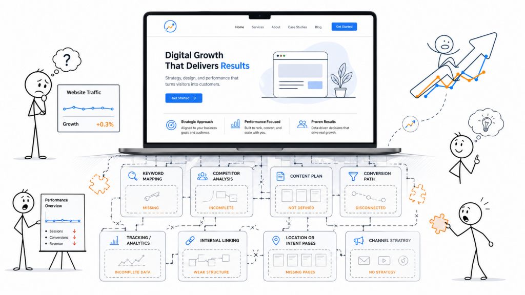 A website growth strategy is the plan behind how a website will attract the right people, explain the business clearly, support traffic channels, convert visitors into leads or customers, and keep improving over time. It is not just SEO. It is not just design. It is not just analytics. It is the connection between all of those layers.
